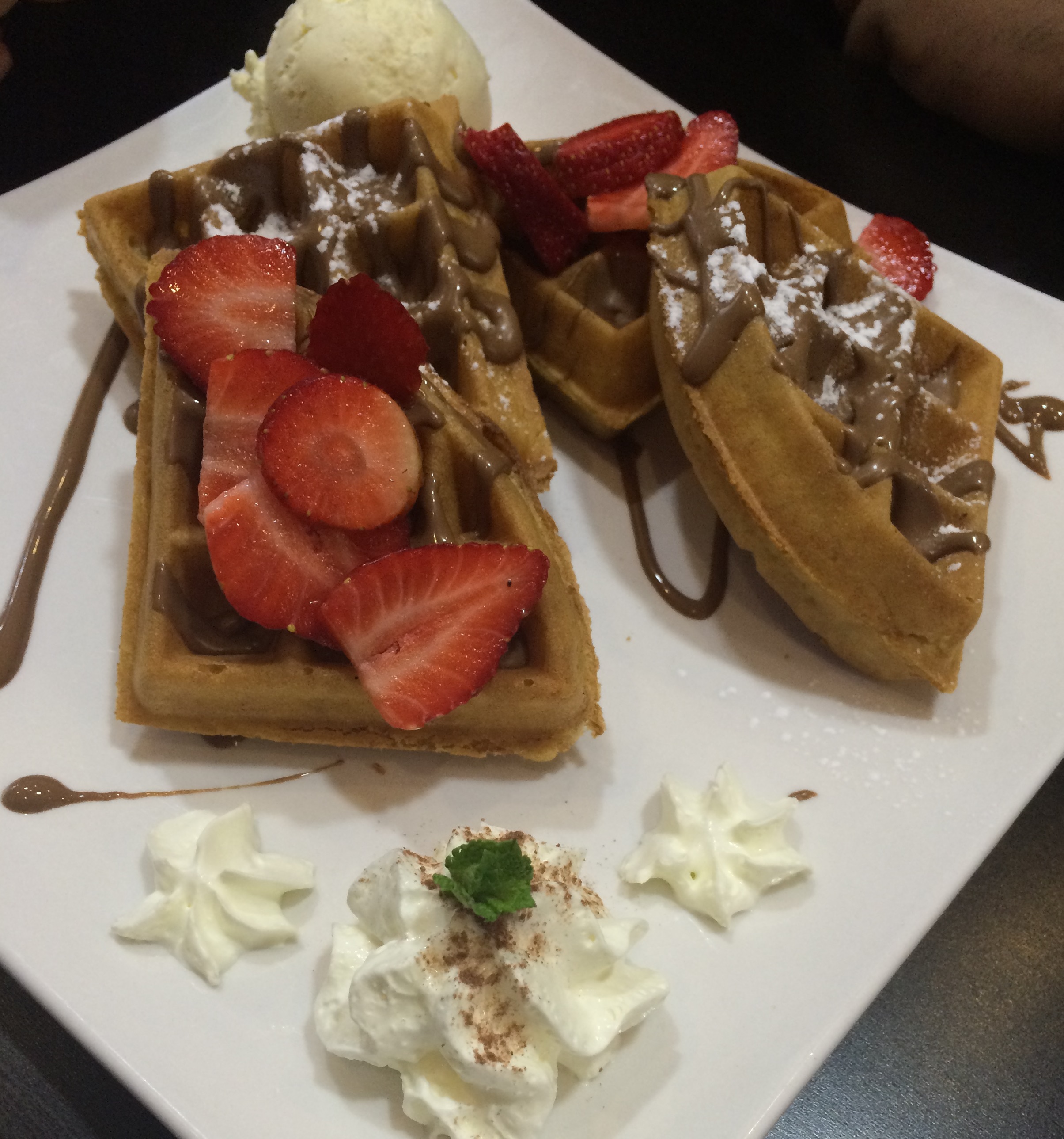 I had the Choc Chip Cookie Dough with a scoop of White Chocolate Ice Cream which was pretty good, the cookie dough was not the best I have had but was decent. It was not as gooey or choclatey as I have had at other places. One of my friends was unsure what he wanted and eventually ordered a very simple custard with Madeira cake which to be fair tasted pretty decent. We also ordered a Chocolate Sundae which seemed to finish very quickly from a guy who claimed to be “full”. Food came after a short wait and water was provided which is essential when having dessert as it does seem to dry out the throat. Both waffles we ordered seem to go down a treat and the consistency of the waffle seemed just right, its never a pretty sight when you get a soggy waffle. 7/10