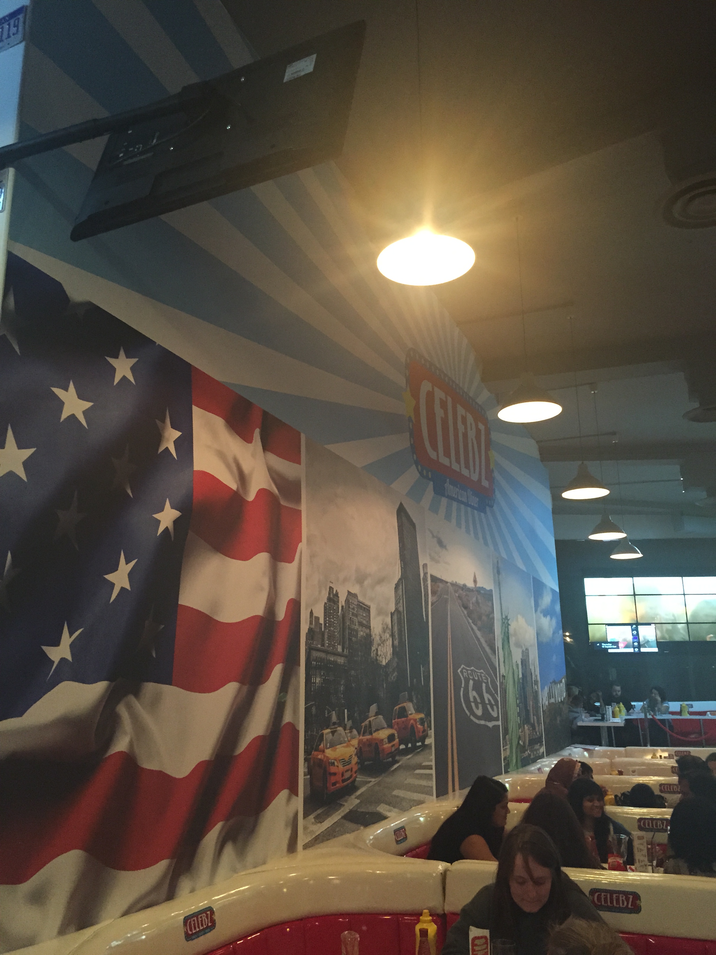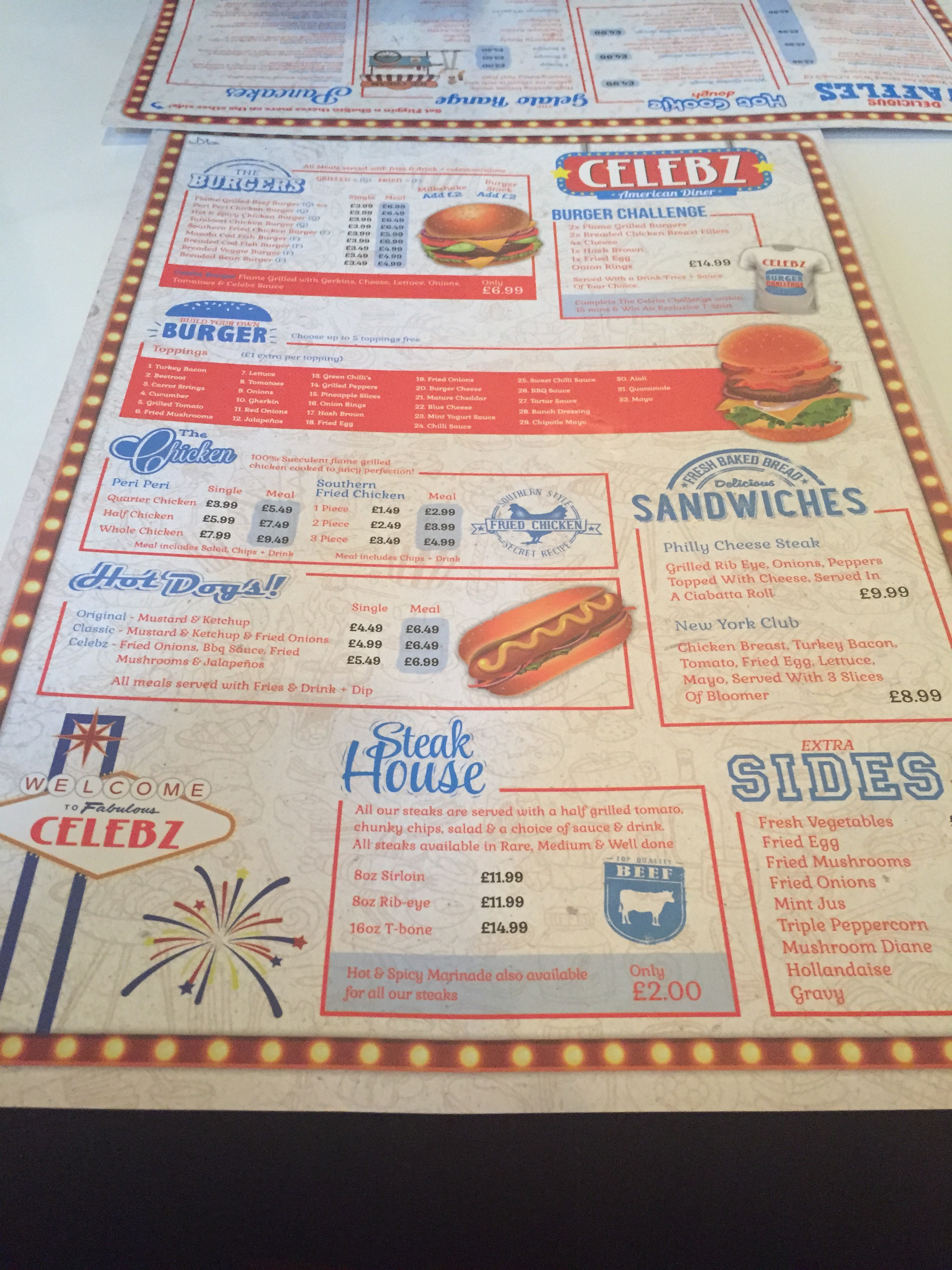 Food: It has a very diner-esque feel and plus your Steaks etc. I went for a Beef burger with my friend opting for a hot dog, both as meals. The hot dog came first and was piping hot and looked pretty special as the pics show and came accompanied with a good set of fries…a good start however this is when it started to go a bit downhill. The Beef burger came warm at best and had grease dripping out from the bottom which made the bottom bun a tad soggy with the annoying thing was the burger could have been really nice however the little things make a big difference. The drinks were a bit flat we felt and when you are paying a premium price you expect a premium product which I am not sure Celebz delivered on. The fries portions were tiny and inconsistent with the Hot Dog meal having about double the amount of the other meal. 5/10